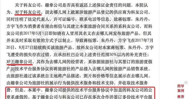 对于去哪儿网,法院认定,北京趣拿作为平台经营者,系依据旅游社与其签订的旅游度假产品技术平台服务协议而将旅游社的产品接入去哪儿网的旅游产品销售系统,由旅游社通过该系统自主地将产品描述、图片和价格等信息展示在去哪儿网,由北京趣拿为旅游社的展示行为提供技术服务和技术支持,并收取技术服务费。