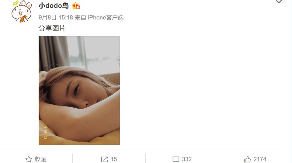 网友往这个方向猜测的原因,和豆得儿前几日在微博中晒出的内容有关,在9月8日,她po出了一张趴在床上,一脸幸福的照片,粉丝纷纷猜测她是谈恋爱了。