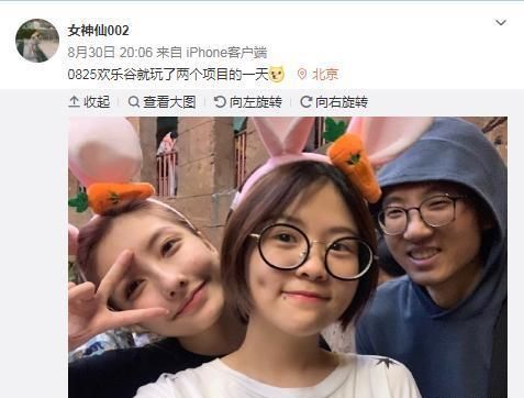 图为池子表姐发出的微博,配图是豆得儿、池子和他表姐三人一起在欢乐谷的合照↓