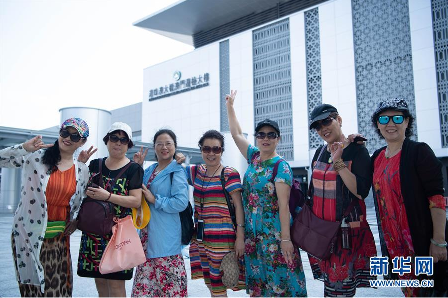 10月24日上午,旅客在港珠澳大桥澳门边检大楼附近合影。 2018年10月23日,港珠澳大桥正式开通。在这座圆梦桥、同心桥、自信桥、复兴桥开通一周年之际,记者亲自体验“一桥连三地、一日游三城”的悠闲与便利,于不同的旖旎风光中自在游览,在不同的城市风貌间自如切换。 新华社记者 张金加 摄