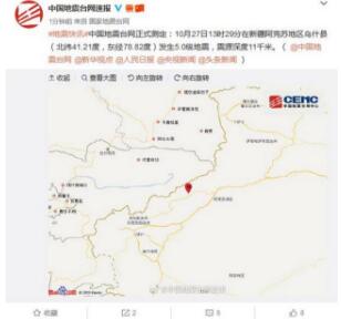 中国地震台网微信号消息,新疆阿克苏地区乌什县10月27日下午发生2次地震,最高5.0级。10月27日13时29分在新疆阿克苏地区乌什县发生5.0级地震,震源深度11千米,震中位于北纬41.21度,东经78.82度。地震发生后,当地政府和消防部门已启动应急预案。目前,暂无人员伤亡和财产损失报告。新疆地震局数据显示,震中距乌什县34公里,距阿克苏地区阿克苏市121公里,距乌鲁木齐市778公里。震中5公里范围内平均海拔约2263米。本次地震周边20公里内无村庄分布。