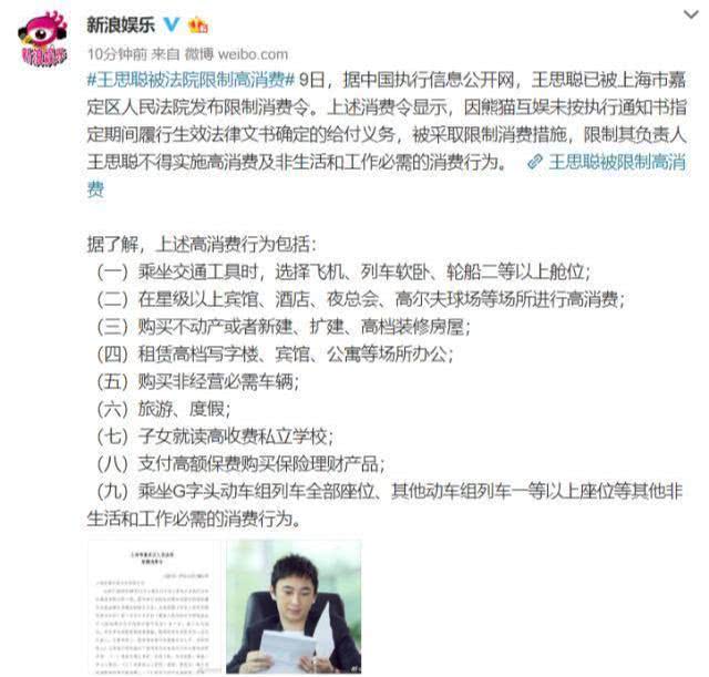 11月9日,王思聪被上海嘉定区人民法院发布限制消费令,因为熊猫互娱未按执行通知书制定期间履行生效法律文书确定的给付义务,因而被采取了限制消费措施。