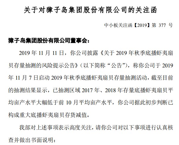 对于獐子岛的“套路”,在历经两次类似剧情后,深交所可谓反应迅速。在獐子岛风险提示公告发布20分钟后,深交所即发出关注函,要求獐子岛说明扇贝在10月末至今短时间内出现较大面积死亡的原因,及公司是否存在隐瞒减值迹象。