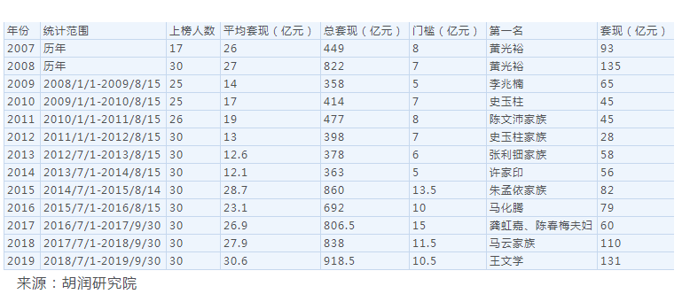 《2019胡润套现企业家30强》上榜门槛从去年的11.5亿下降到10.5亿。榜单中套现数额主要是从2018年7月1日至2019年9月30日的数字。