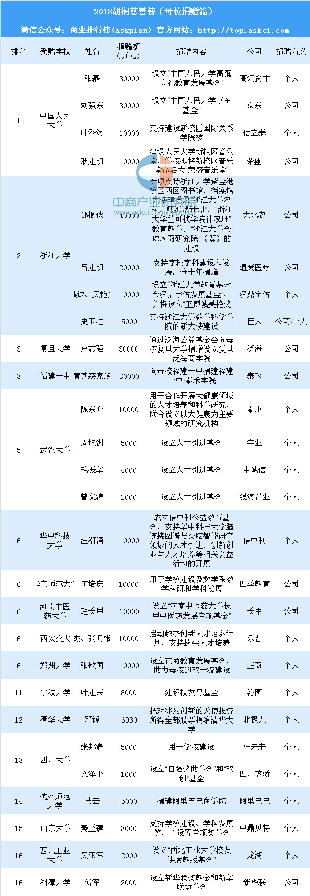 据胡润发布了《2018胡润慈善榜》,2018年捐赠母校人数比上年多1位,有27位上榜。其中受捐过亿的大学有:中国人民大学受捐8亿元;浙江大学受捐7.5亿元;复旦大学受捐3亿元;武汉大学受捐2.1亿元;华中科技大学、华东师范大学、河南中医药大学、西安交大和郑州大学分别受捐1亿元。另外福建一中受捐3亿元,与复旦大学并列第三。