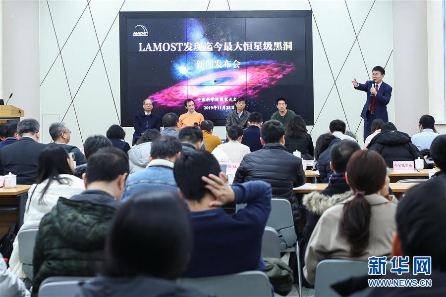 11月27日 中国科学院国家天文台副台长、研究员、论文第一作者刘继峰在发布会上发布郭守敬望远镜(LAMOST)发现迄今最大恒星级黑洞科学成果。 新华社发