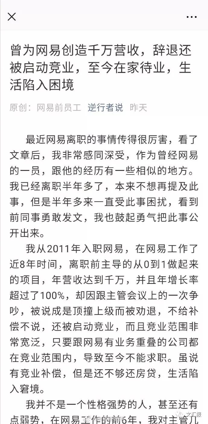 据@中国新闻网 消息,日前,网易被一位前员工发文指出“暴力裁员”后,11月27日晚又一位自称网易前员工的人发文称:曾为网易创造千万营收,因跟主管会议上的一次争吵,被说成是顶撞上级而被劝退,不给补偿不说,还被启动竞业,而且竞业范围非常宽泛,只要跟网易有业务重叠的公司都在竞业范围内,导致至今不能求职,竞业补偿还不够还房贷,生活陷入窘境。对此,网易方面回应称:同步了解中。