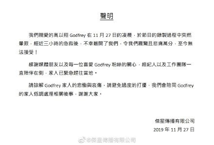 今日上午,高以翔经纪公司发布声明,确认台湾艺人高以翔于11月27日凌晨在录制节目过程中突然晕厥,经过3小时的急救,不幸去世。