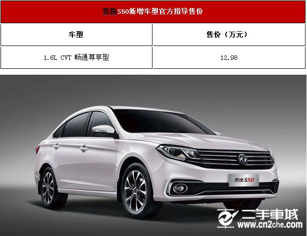 目前,景逸S50新加车子型号到市场,这一次仅公布一款1.6L CVT通畅尊享型,售价为12.98万元。比较1.6L CVT通畅奢华型配置有必定幅度添加,但价值也提升了六千元。具体价值具体概况,请看下图: