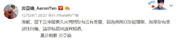 同时,他也在另一社交平台发文,“我的问题,我真的很差劲,平安夜一点也不平安,如果未来还是这样跟拍,不知道还会撞倒多少人。”最后他还再次强调是自己的问题。