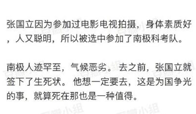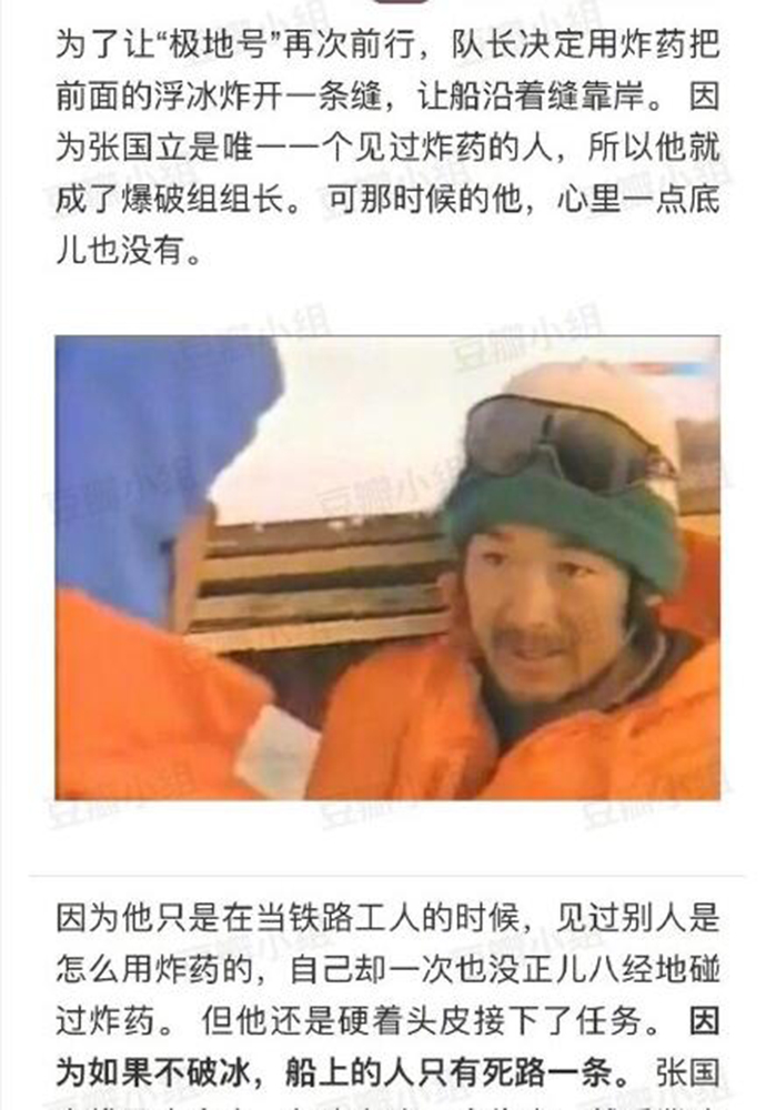最近,“共青团中央”曝光了30年前张国立参加南极科考队,并且冒着生命危险炸浮冰救了一船人!张国立当年是随纪录片《长城向南延伸》摄制组参加南极科考,但是没想到他懂得真多,不仅是演员、副导演、摄像师、策划,而且在科考船遇到冰崩时担任了爆破组长,因为整条船懂炸药的只有他,上岸后张国立又干起了混凝土工、电焊工、搬运工,参与了建设中山站!