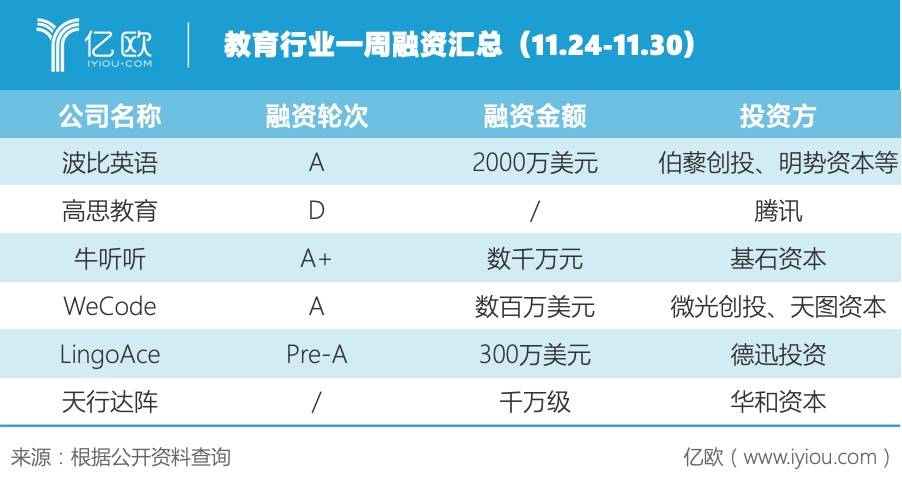在过去一周(11.24-11.30)里,教育领域共有6家企业获得融资,轮次偏早期,分布在K12辅导、少儿英语和少儿编程等领域。其中,K12辅导公司高思教育宣布已经完成了由腾讯投资的D+轮融资。