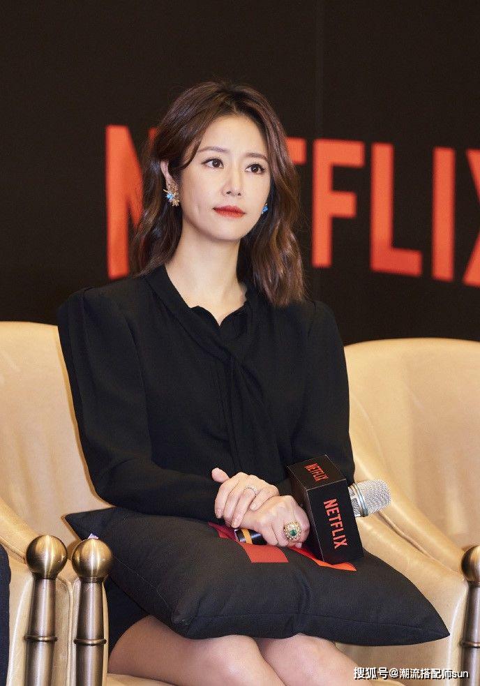 黑裙对肤色的要求不高,但由于色彩单调沉闷,因此采用的材质不应过于厚重,否则容易产生“黑压压”的视觉效果,难以穿出美感。林心如的这一身黑裙采用薄纱面料制作而成,领口部分融入飘带设计,可以体现出薄纱的轻薄感,中和黑色过分沉闷的缺点,同时也保持了造型简约大方的风格,名媛范儿十足。