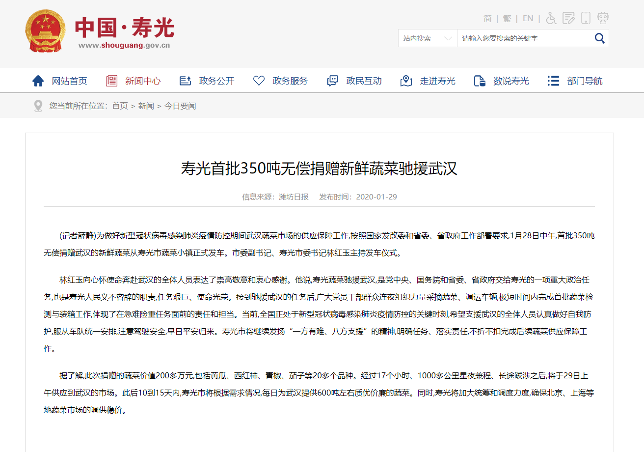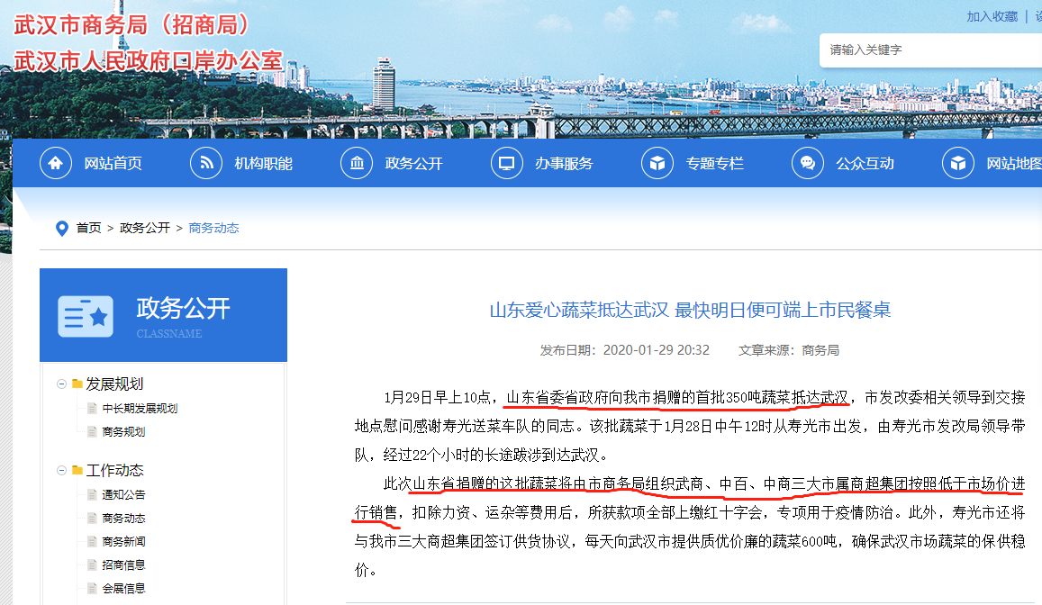 1月29日,该批蔬菜到达武汉,武汉多家媒体曾公开报道。同时,武汉市商务局网站上也发布了相关消息,消息显示,“1月29日早上10点,山东省委省政府向我市捐赠的首批350吨蔬菜抵达武汉”,“这批蔬菜将由市商务局组织武商、中百、中商三大市属商超集团按照低于市场价进行销售,扣除力资、运杂等费用后,所获款项全部上缴红十字会,专项用于防治”。