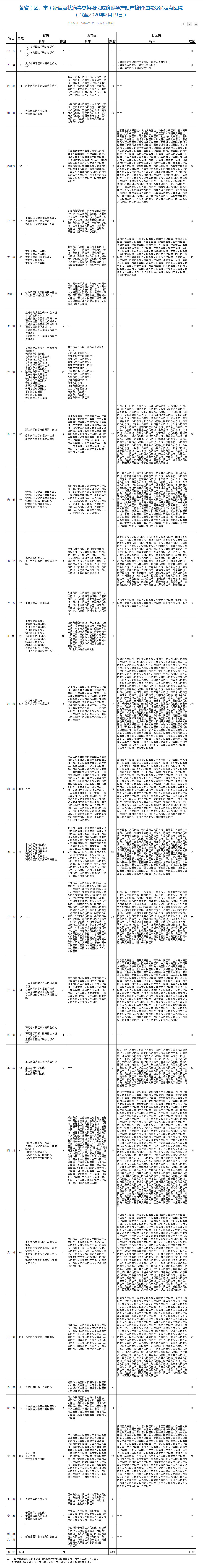 中新网2月20日电 国家卫健委妇幼健康司2月20日公布各省(区、市)新型冠状病毒感染疑似或确诊孕产妇产检和住院分娩定点医院名单(截至2020年2月19日),共1654家,其中省级定点医院99家,地市级定点医院449家,县区级定点医院1135家。