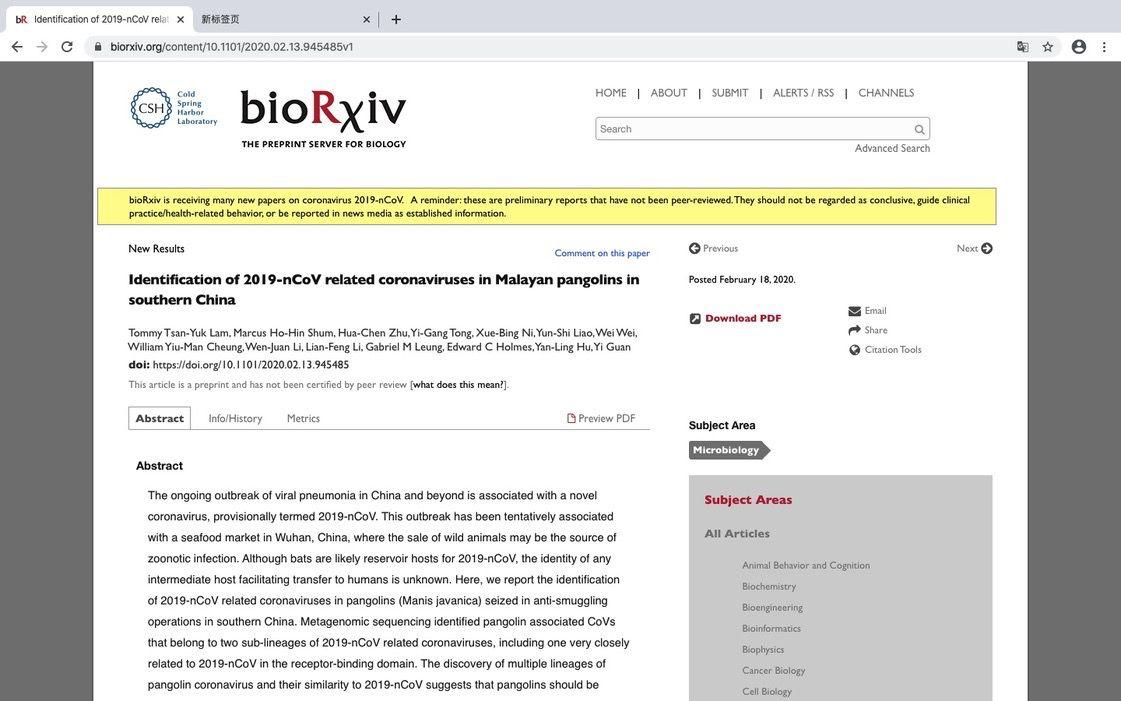 2月18日,香港大学管轶教授课题组与广西医科大学胡艳玲课题组合作的工作在论文预印网站bioRxiv上发布,该研究表明穿山甲很可能是新冠病毒从蝙蝠到人类的中间宿主。