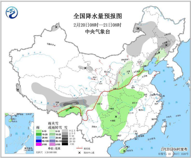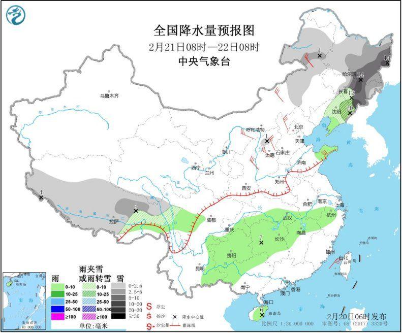 图1 全国降水量预报图(2月20日08时-21日08时)