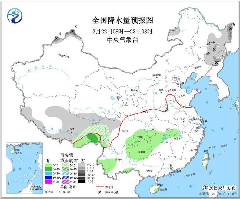 图3 全国降水量预报图(2月22日08时-23日08时)