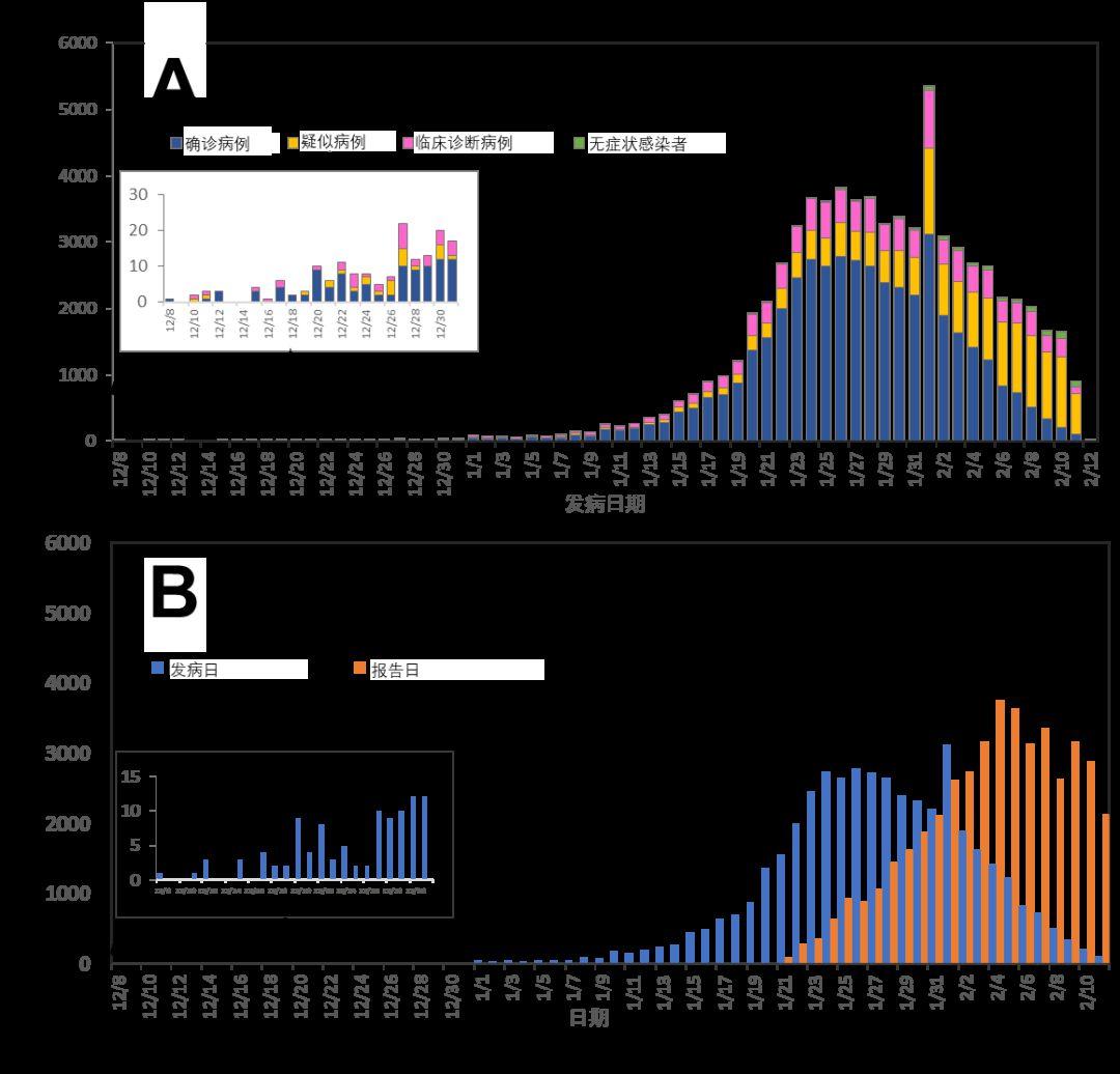 图1 新型冠状病毒肺炎病例四类病例发病曲线以及确诊病例报告日期与发病日期流行曲线