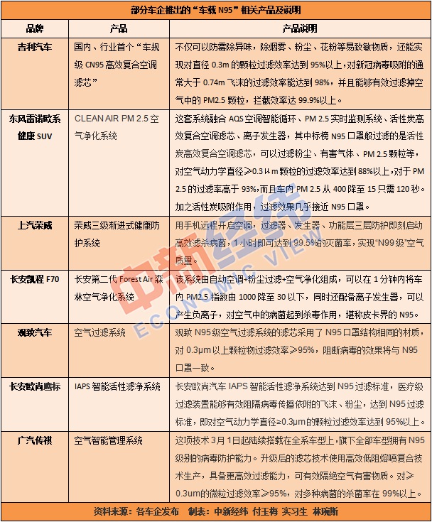 据悉,汽车的“口罩”为车辆搭载的空气净化功能产品,常见的有三种:车载空气净化器、负离子(银离子)发生器以及空气质量管理系统,效果因产品而异,主要是专用于净化汽车内空气中的PM2.5、有毒有害气体、异味、细菌等。经中新经纬记者不完全统计,截至目前,至少有7家车企借“N95”的概念推出相关产品。