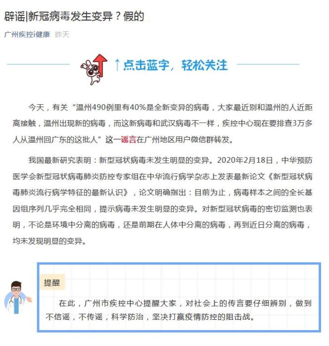 广州市疾病预防控制中心介绍,18日,有关“温州490例里有40%是全新变异的病毒,大家最近别和温州的人近距离接触,温州出现新的病毒,而这新病毒和武汉病毒不一样,疾控中心现在要排查3万多人从温州回广东的这批人”这一谣言在广州地区用户微信群转发。