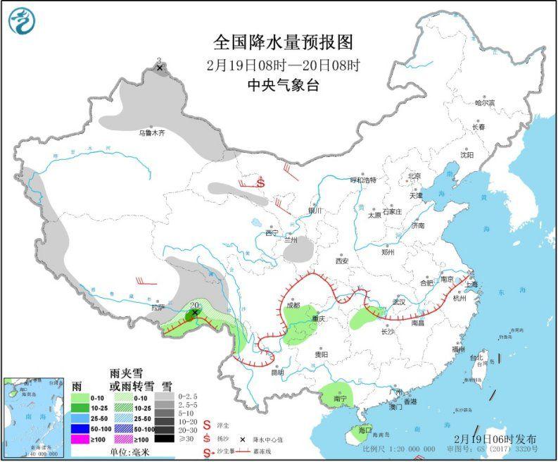 2月19日08时至20日08时,新疆北部、甘肃西部和南部、西藏南部和东部、青海南部等地的部分地区有小到中雪或雨夹雪;湖南西北部、广西南部、海南岛中东部、四川东南部、重庆西南部、西藏东南部等地的部分地区有小雨,其中,西藏东南部局地有中雨。内蒙古西部、甘肃河西、西藏等地有4~6级风(见图1)。