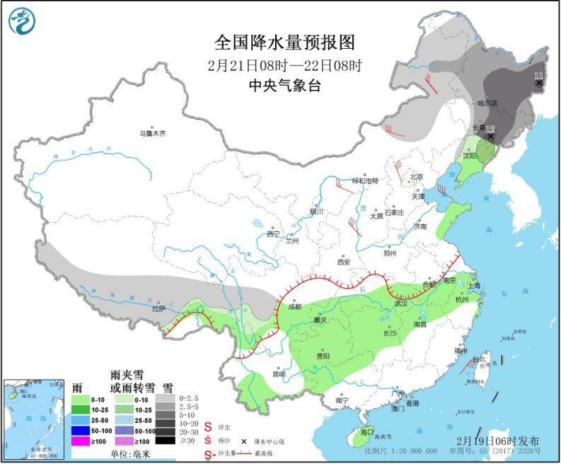 图2 全国降水量预报图(2月20日08时-21日08时)