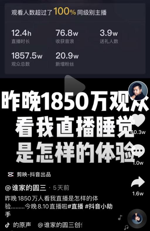 平台数据显示,当天约有1857万人围观了“圆三”睡觉,直播结束后,“圆三”的粉丝涨了60万,收获了7.6万元打赏。据“圆三”在视频中介绍,短短两天时间内,他的粉丝数量从3.7万涨到了80多万。