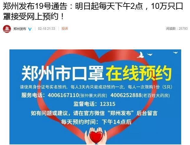 通告称,为满足人民群众基本防控需求,自2月19日(周三)起郑州市陆续组织民用口罩货源投放市场。有关事项如下: