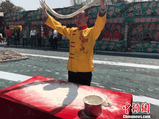 青海的拉面师傅展示拉面穿针技艺。 李增兆 摄