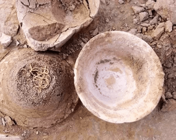 惊恐不定的人打翻了陶碗,倒扣在地上,