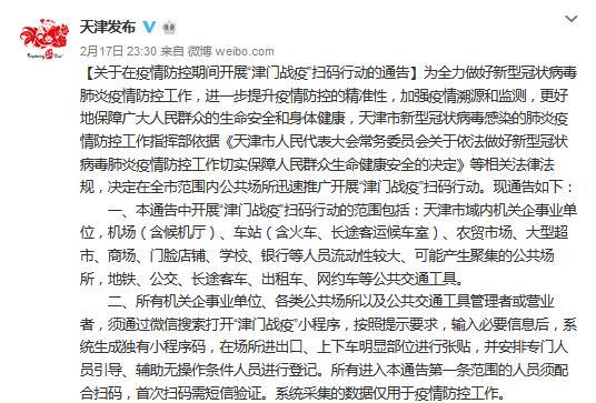 通告称,为全力做好新型冠状病毒肺炎疫情防控工作,进一步提升疫情防控的精准性,加强疫情溯源和监测,更好地保障广大人民群众的生命安全和身体健康,天津市新型冠状病毒感染的肺炎疫情防控工作指挥部依据《天津市人民代表大会常务委员会关于依法做好新型冠状病毒肺炎疫情防控工作切实保障人民群众生命健康安全的决定》等相关法律法规,决定在全市范围内公共场所迅速推广开展“津门战疫”扫码行动。具体如下: