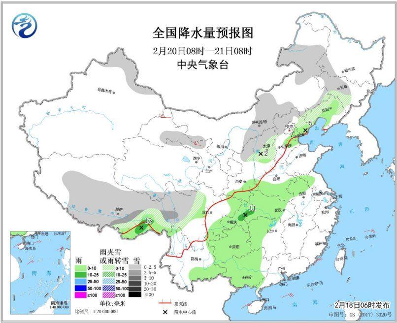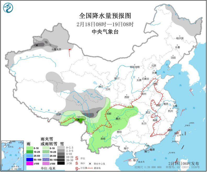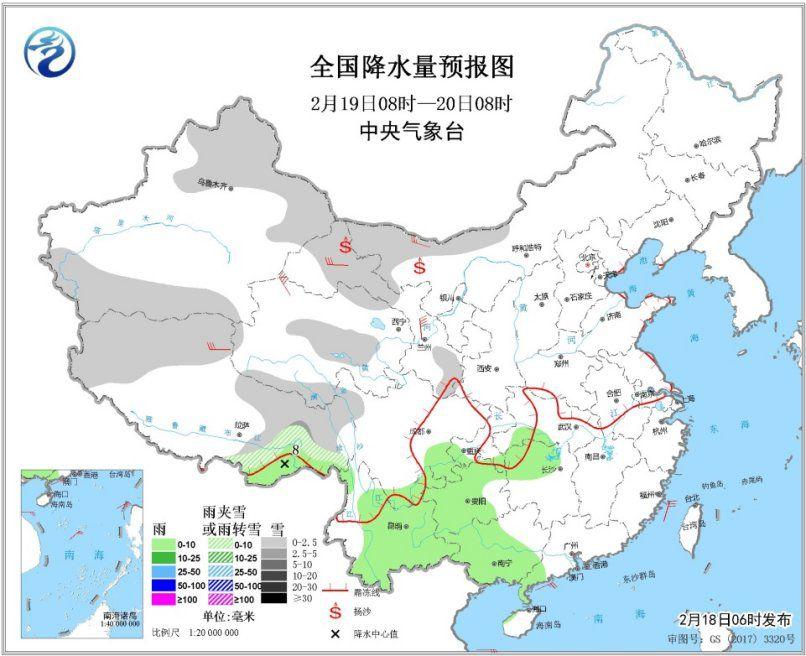 图1 全国降水量预报图(2月18日08时-19日08时)