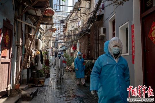 2月16日,湖北省武汉市,民生社区磨子桥,华中港行公司的5名员工在社区内巡检。他们日常的工作是帮助社区消毒、值守。中青报·中青网记者 李隽辉/摄