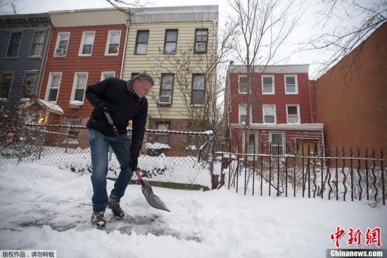 当地时间1月3日,美国纽约,纽约新任市长白思豪Bill de Blasio清理自家门前道路上的积雪。自1月2日开始,今年首场暴风雪席卷美国中西部到东北部大部地区,并带来强风、暴雪和剧烈降温天气,影响范围波及22个州1亿居民。