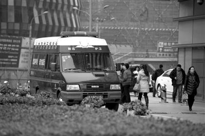 2014年2月18日,振远护卫的押运车停在慈云寺桥边的一家银行前等待执行押运任务。新京报记者 侯少卿 摄